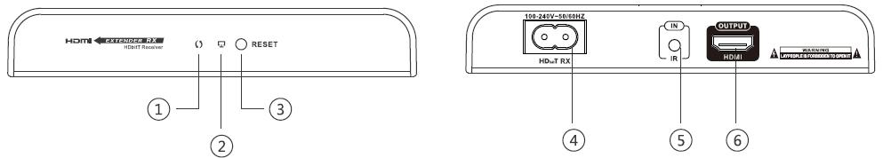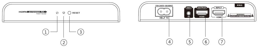 1. Dioda sygnalizacji podłączenia zasilania. 2. Dioda sygnalizacji transmisji danych. 3. Przycisk RESET. 4. Gniazdo HdbitT TX 100-240V AC 50/60Hz. 5. Gniazdo jack 3,5mm przewodu IR OUT. 6. Gniazdo HDMI OUTPUT do podłączenia lokalnego odbiornika TV. 7. Wejście HDMI HDMI INPUT. |