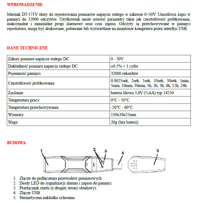 MIERNIK NAPIĘCIA I PRĄDU Z REJESTRATOREM USB DT-171V