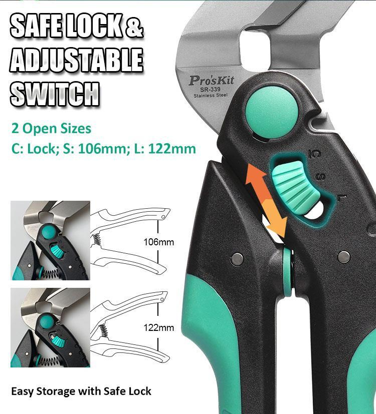 - Pozostałe cechy i funkcje: ząbkowane ostrze, wbudowana blokada bezpieczeństwa z dwoma ustawieniami rozwarcia uchwytu, wbudowana sprężyna rozwierająca ułatwiająca pracę, ergonomiczny antypoślizgowy uchwyt, kąt uchwytu względem ostrzy: 45°