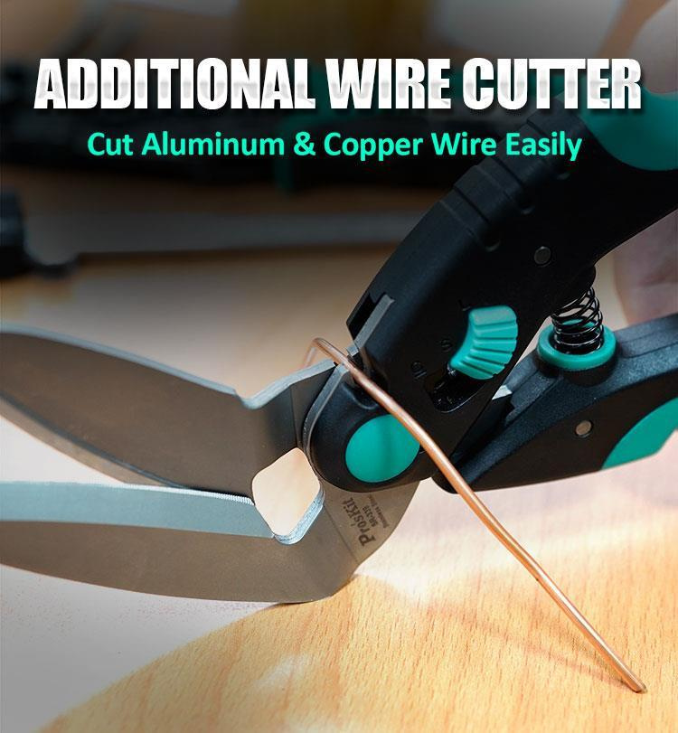 - Narzędzie umożliwia cięcie: skóry o grubości do 5mm, gumy o grubości do 4mm, drut Cu oraz AL do Ø2,5mm, blachy Sn 0,4mm, blachy Cu 0,5mm, blachy Al 0,8mm, plastik o grubości do 1,2mm, siatki, stalowe liny, nylonowe/bawełniane do Ø10mm, tkaniny, płyty CD, katrony itp