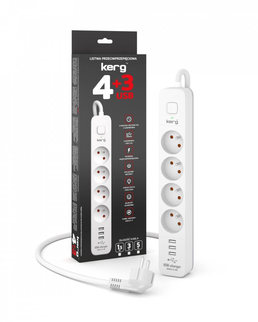 PRZEDŁUŻACZ Z UZIEMIENIEM 4 GNIAZDA 3M KERG M02414 Z WYŁĄCZNIKIEM I USB