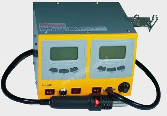 Stacja lutownicza ZD-982 przeznaczona jest do montowania i demontowania elementów i podzespołów elektrycznych i elektronicznych techniką lutowania. Temperatura grota lutownicy i strumienia powietrza jest regulowana podczas pracy przez dwa mikroprocesory z zastosowaniem wysokiej jakości czujników. Najwyższa precyzja i optymalizacja dynamicznych parametrów urządzenia uzyskana jest dzięki szybkiemu układowi regulacyjnemu, zaprojektowanemu specjalnie do pracy ze spoiwem bezołowiowym. Regulowany w szerokim zakresie strumień powietrza zasilany z pompy membranowej o niskim poziomie hałasu. |