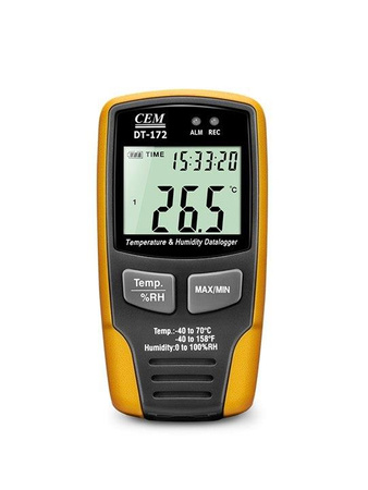 Termohigrometr DT-172 służy do rejestrowania pomiarów temperatury i wilgotności. Umożliwia zapis w pamięci do 32700 odczytów. Użytkownik może ustawić parametry takie jak częstotliwość próbkowania, maksymalne i minimalne progi alarmowe i inne. Odczyty są przechowywane w pamięci rejestratora, mogą być drukowane, pobierane lub wyświetlane na monitorze komputera przez interfejs USB.