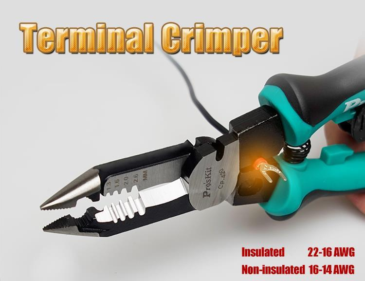 - ściągacz izolacji z przewodów 1.3/1.6/2.0/2.6mm (AWG16/14/12/10) - obcinacz przewodów miedzianych Cu 8AWG/8.4mm2 - wewnętrzny obcinacz drutów twardych <Ø2,0mm - zaciskacz konektorów izolowanych AWG22~16 i nieizolowanych 16~14 - szczypce do krępowania - uchwyty pokryte antypoślizgową powłoką - sprężyna powrotna - blokada |