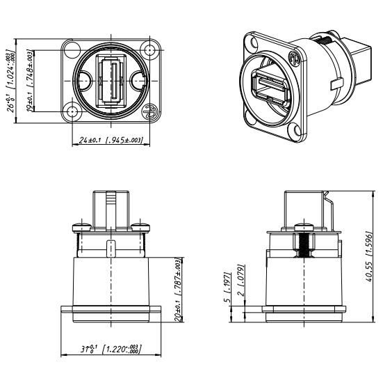 GNIAZDO USB 2.0 MONTAŻOWE NEUTRIK NAUSB-W-B PANELOWE USB A