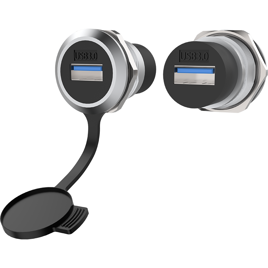 Gniazdo USB 3.0 do montażu na panelach i obudowach z dodatkową zaślepką zabezpieczającą.
