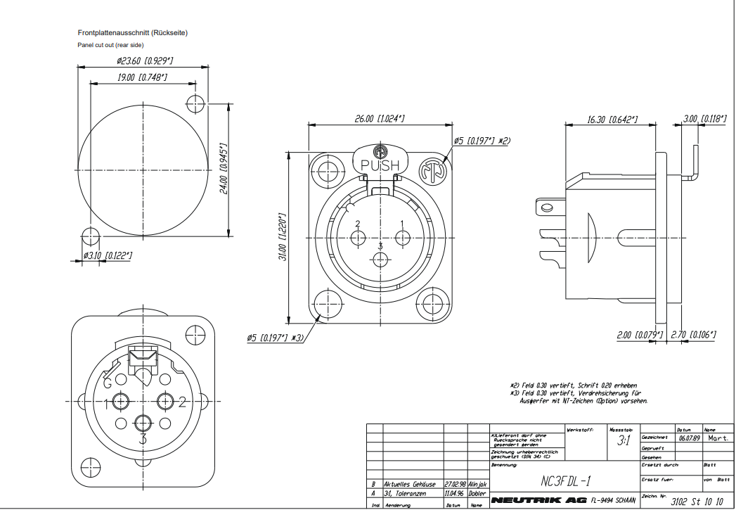 GNIAZDO XLR ŻEŃSKIE TABLICOWE NC3FD-L-1 NEUTRIK