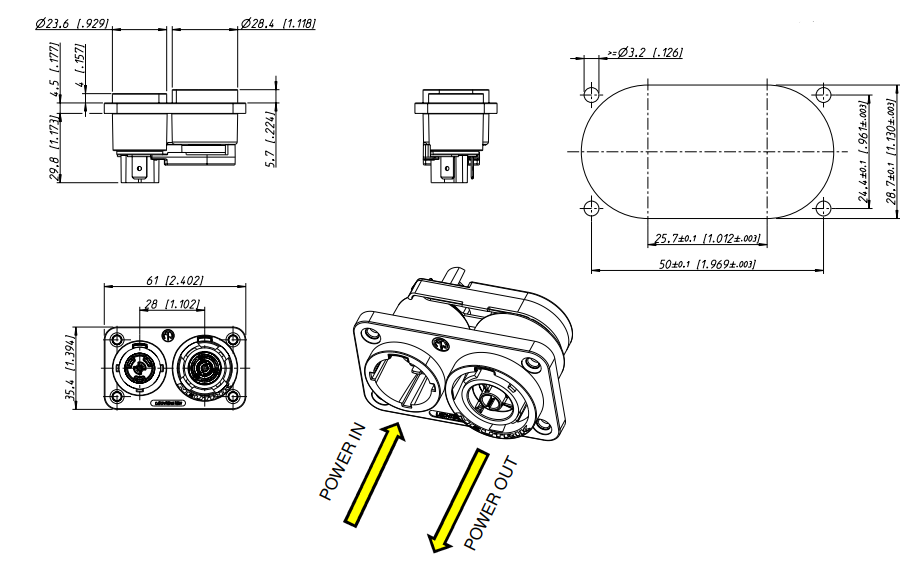 GNIAZDO ZASILANIA POWERCON TRUE1 NAC3PX-TOP PANELOWE DO OBUDOWY IN OUT