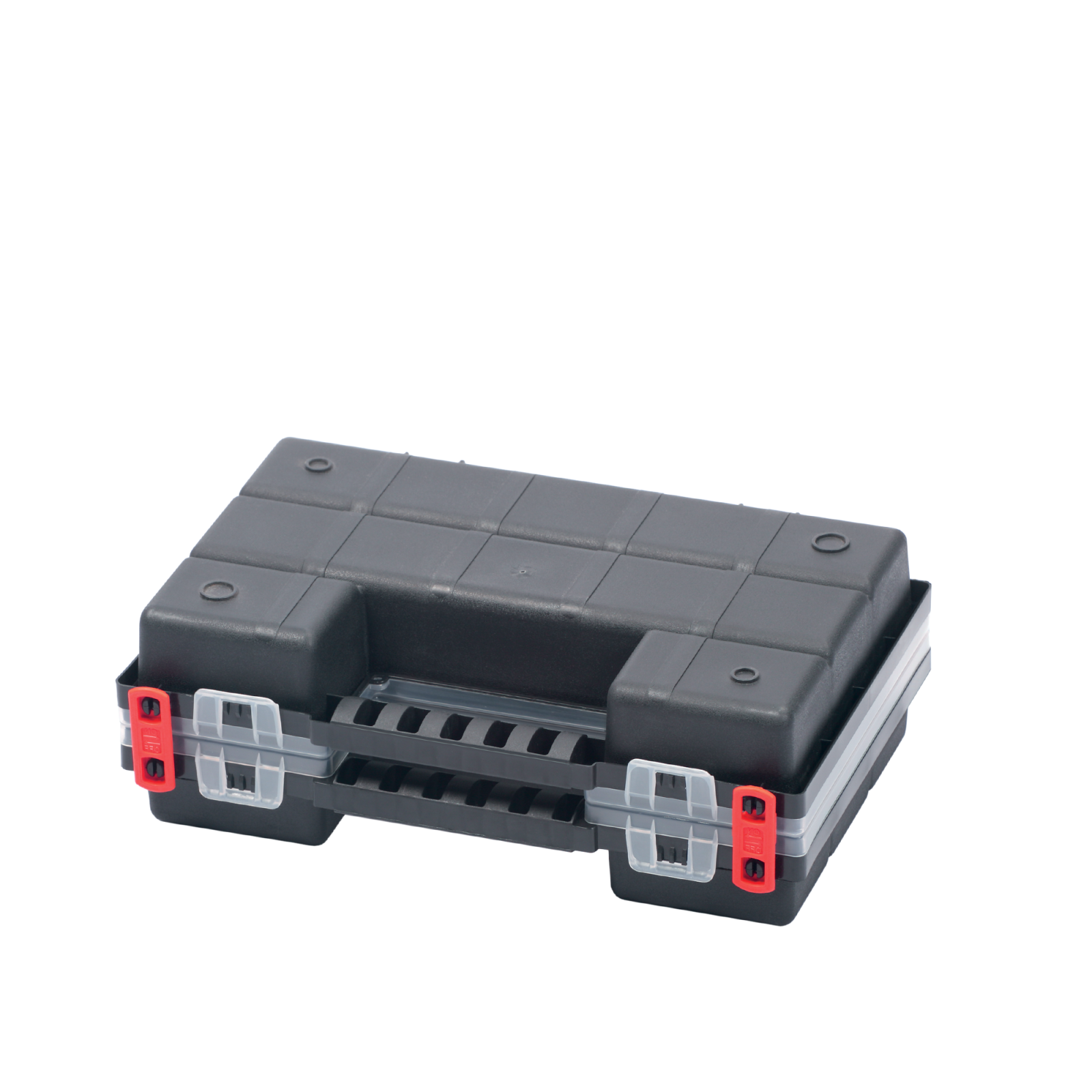 Przezroczysta pokrywa z PP Random zapewnia łatwy podgląd zawartości, co znacznie ułatwia dostęp do odpowiedniego narzędzia podczas pracy. Skorzystaj z 16 wyjmowanych przegród, aby dostosować organizację do swoich indywidualnych potrzeb i utrzymywać narzędzia w doskonałym porządku.