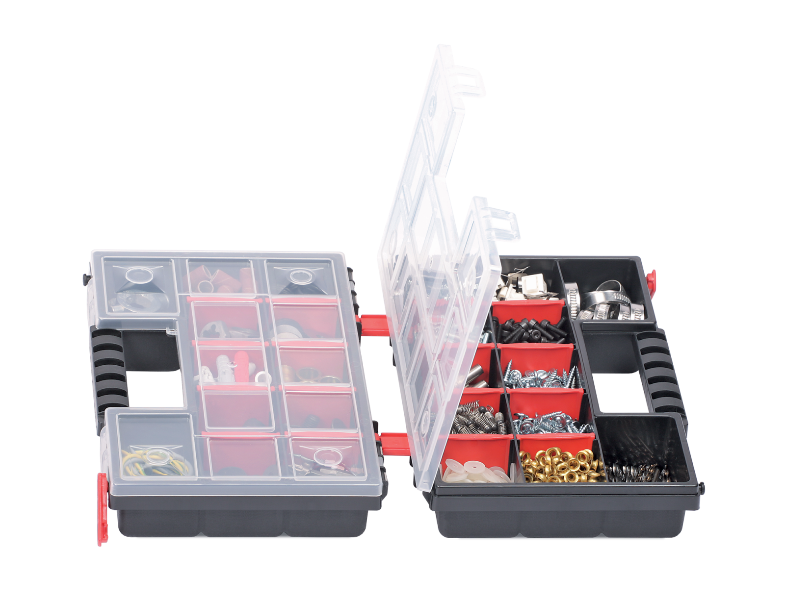 Wykonany z wytrzymałej mieszanki polimerów, ten podwójny organizer posiada 24 przegród, które umożliwiają łatwe segregowanie i organizowanie Twojego wyposażenia narzędziowego. Dzięki ergonomicznemu uchwytowi i mocnym zapięciom, możemy mieć pewność, że nasze narzędzia będą bezpiecznie przechowywane i zawsze na wyciągnięcie ręki.