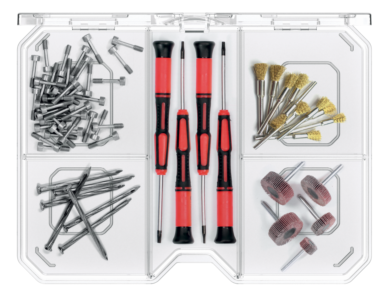 Dodatkowo, skrzynka wyposażona jest w stałe przegrody, które umożliwiają podział wnętrza na pięć różnych przestrzeni, idealnych do przechowywania i segregowania narzędzi lub innych drobnych przedmiotów według własnych preferencji.