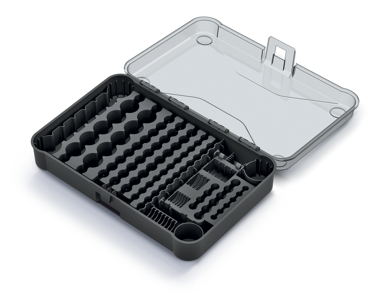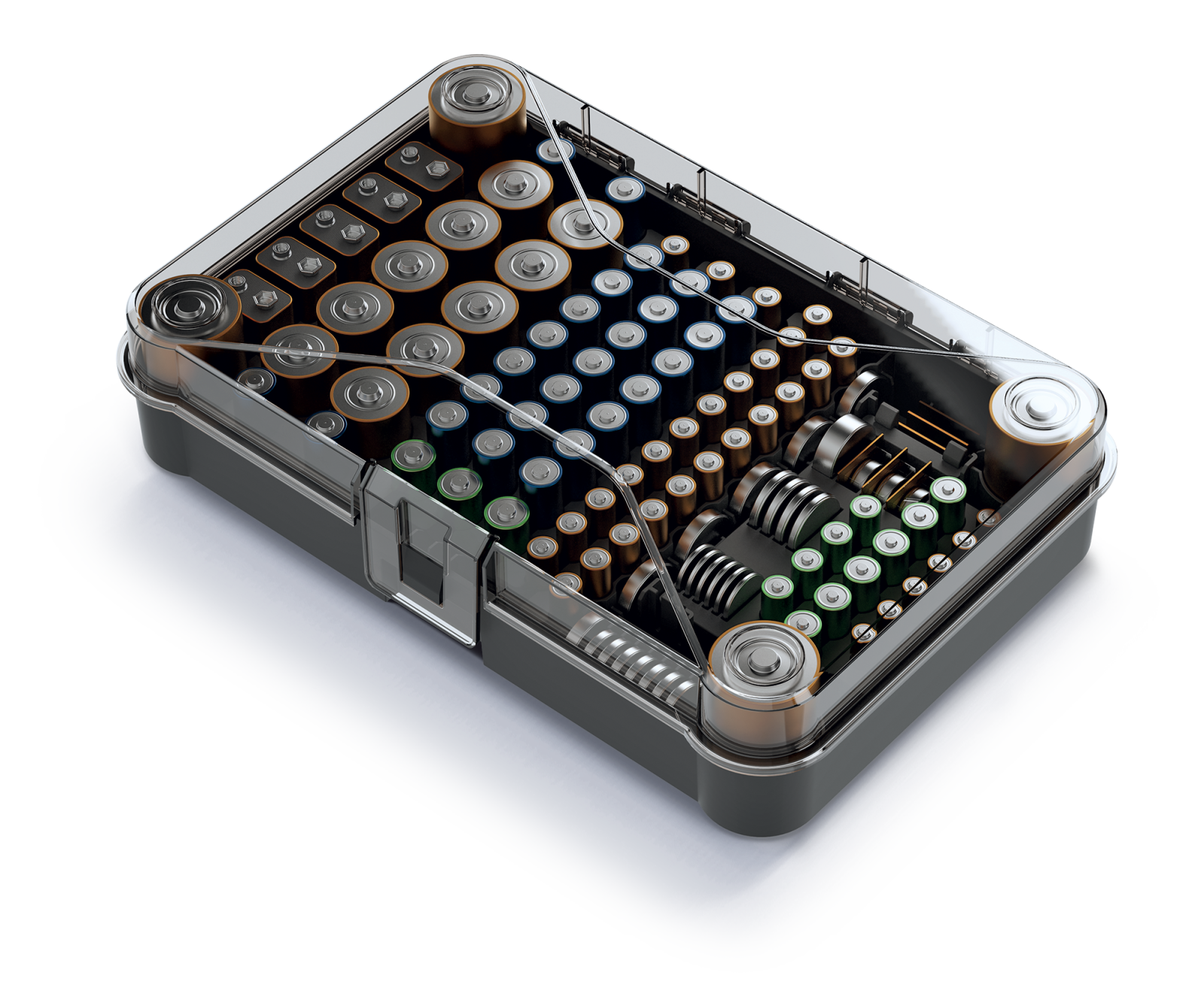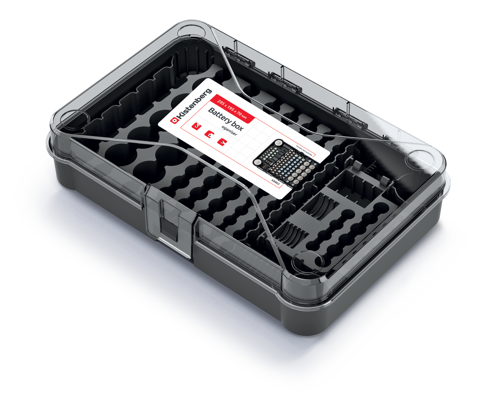 Organizer na baterie Battery Box to praktyczny koszyczek zapewniający porządek w przechowywaniu baterii. Pojemnik zawiera 115 miejsc na baterie, które pomogą zorganizować Twoje zasoby energii. Dzięki transparentnemu designowi z łatwością możesz sprawdzić, ile baterii zostało Ci do dyspozycji. Nie trać cennego czasu na szukanie po zakamarkach - Battery Box uporządkuje Twoje baterie w jednym miejscu, gotowe do użycia w dowolnym momencie.