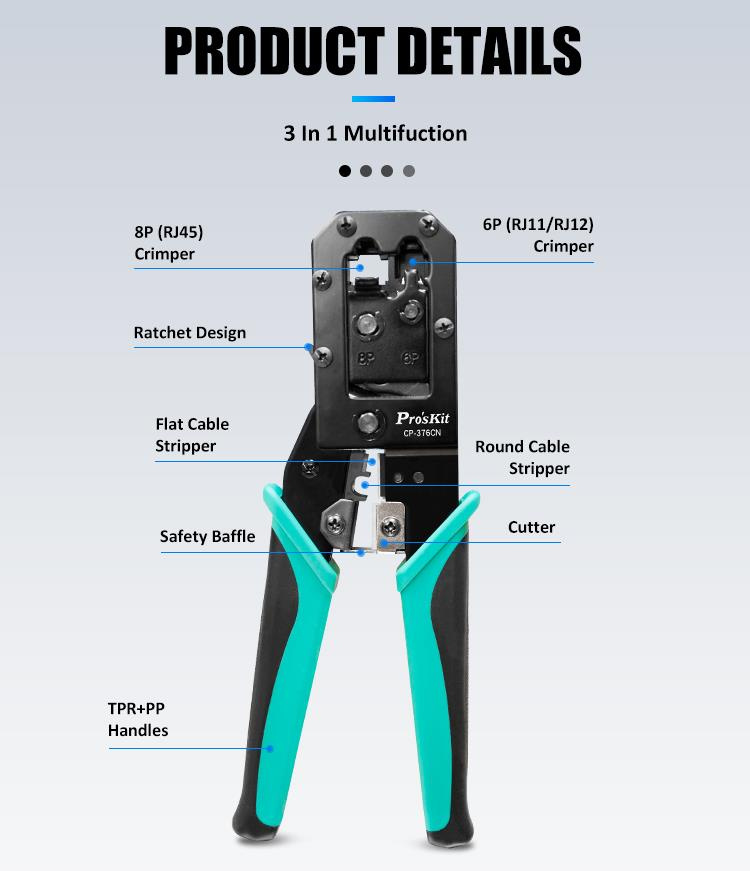 Zaciskarka wtyków CP-376CN to specjalistyczne narzędzie, zaprojektowane do precyzyjnego i niezawodnego zaciskania wtyków 6P/8P kategorii 5 i 6 na przewodach sieciowych. Jest to niezastąpiona pomoc dla profesjonalistów zajmujących się instalacją sieci komputerowych, telekomunikacyjnych.